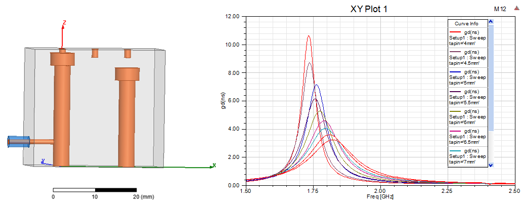 模型和第一次扫描结果如图 4所示,第一次扫描发现两个频率没有对齐(群时延图形不对成),那是因为输入耦合对第一级谐振频率存在牵引。选定一个间距例如LS1=14mm,微调一下谐振器2的高度,使群时延图形对称。扫描结果见图5。