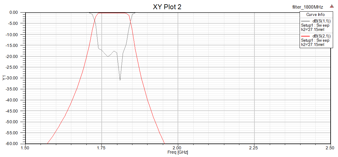 这是因为加入12以及23耦合后对谐振器2和3有频率牵引,通常滤波器中间的谐振器尺寸基本相当,这里使h3=h2再进行一次细微扫描,结果应该就会比较好了,扫描了一次结果见。
