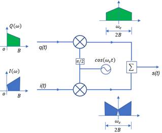 为了具有普遍适用性,假设IQ 调制的数据源为伪随机码,此时基带I 信号和基带Q 信号的频谱是相同的,带宽均为B,二者均携带信息而且信息量相同。IQ 调制采用零中频架构,每一路上变频之后带宽翻倍至2B,但是携带的信息不变。合路后,射频调制信号带宽仍然为2B,但是相对于单路调制而言,携带的信息量翻倍了。因此,IQ调制具有更高的频率利用率!